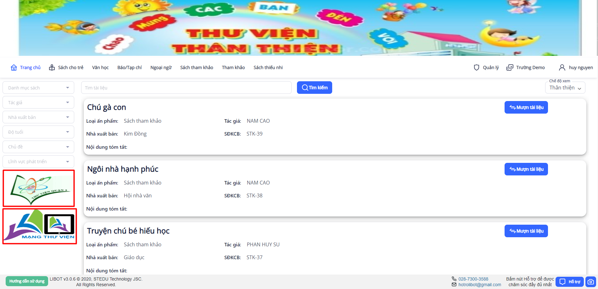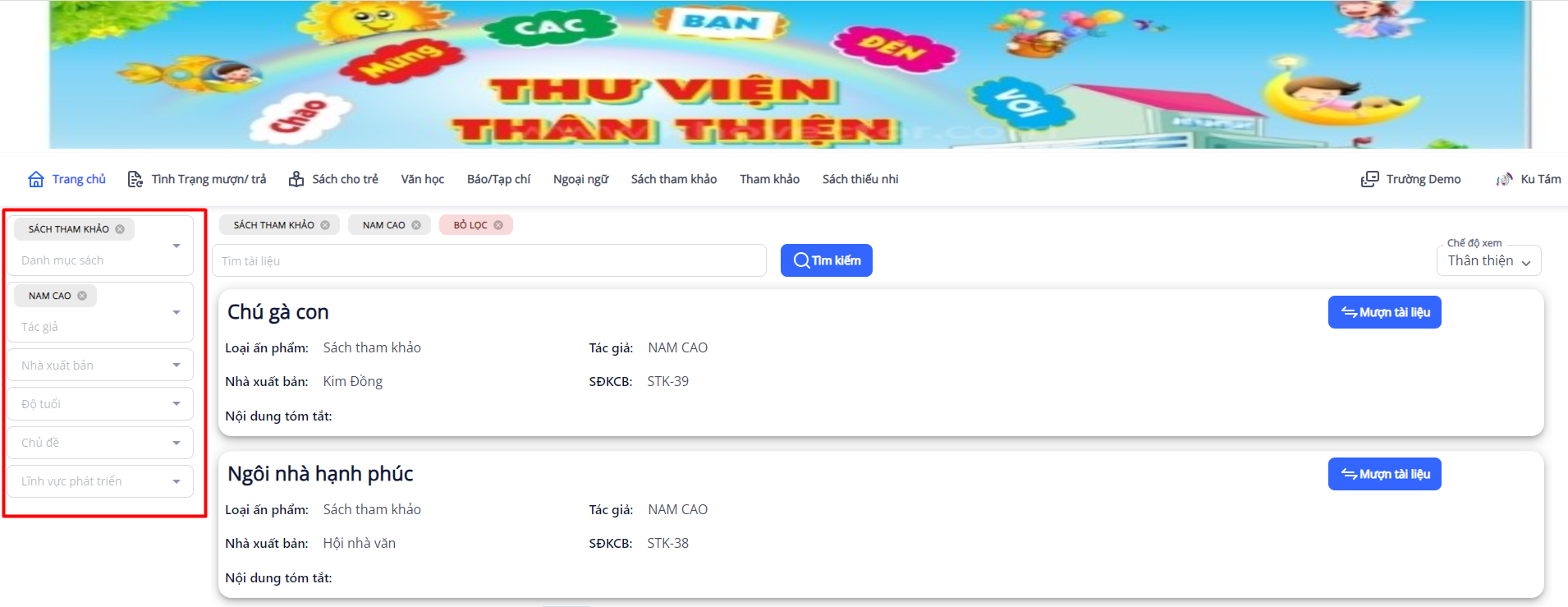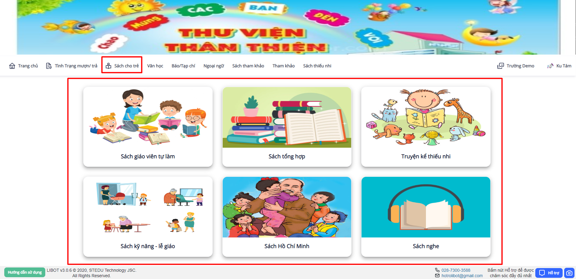 Bấm vào chức năng sách cho trẻ phần mềm sẽ hiển thị phần thư viện dành cho trẻ mà trường đã xây dựng