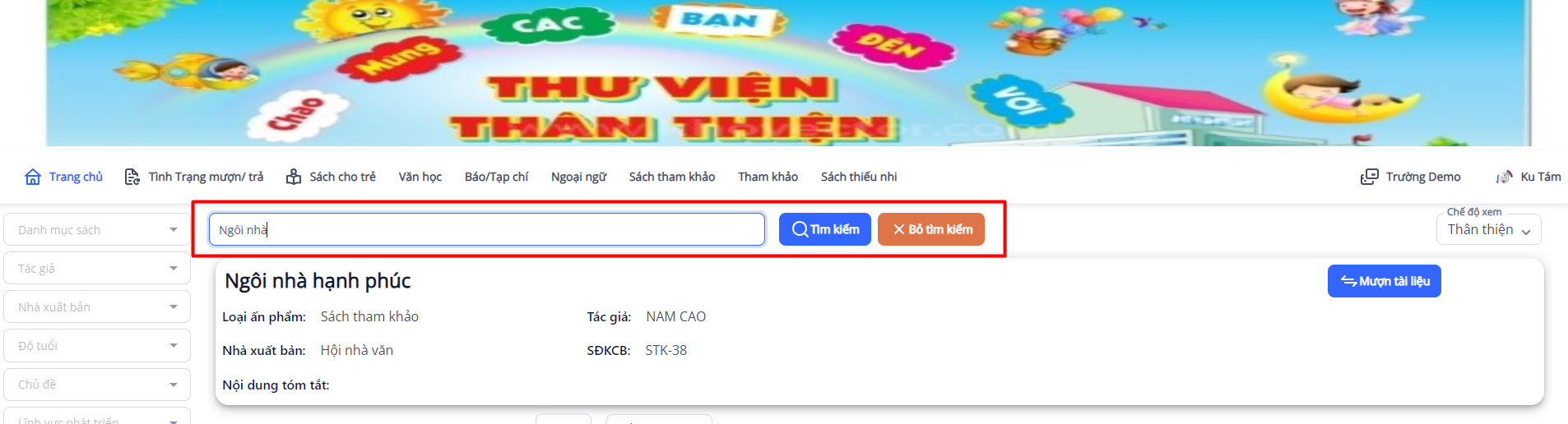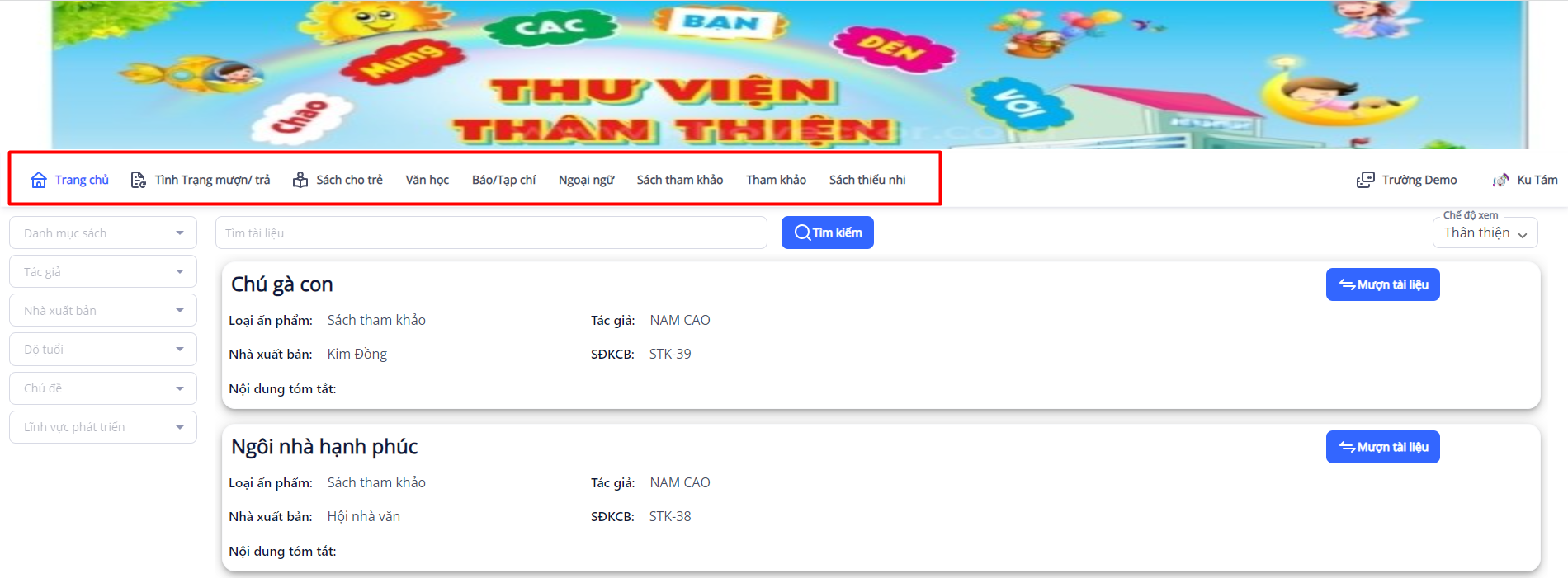 Ở trang chủ có thể xem được tổng quan các danh mục sách trong thư viện trường.