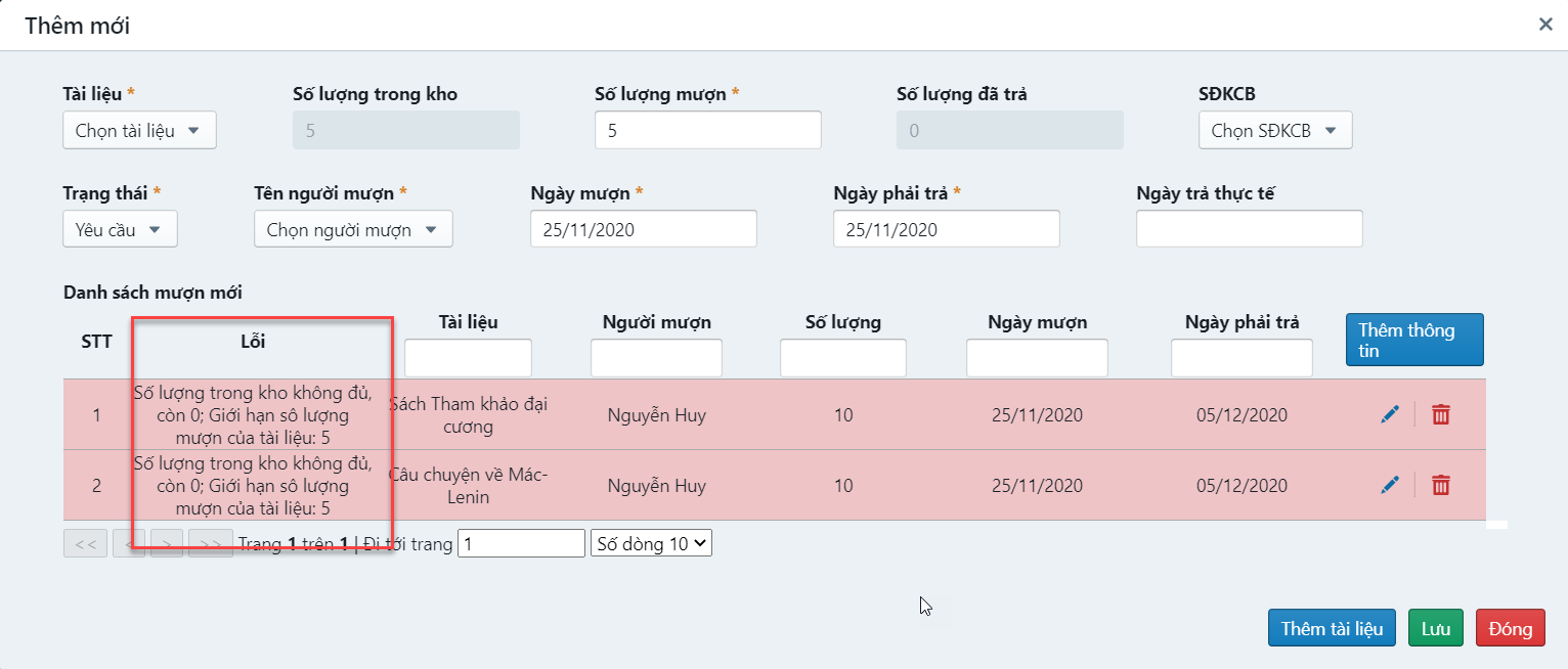 Nếu số lượng sách cần mượn lớn hơn trong thư viện đang lưu trữ hệ thống sẽ báo lỗi như hình