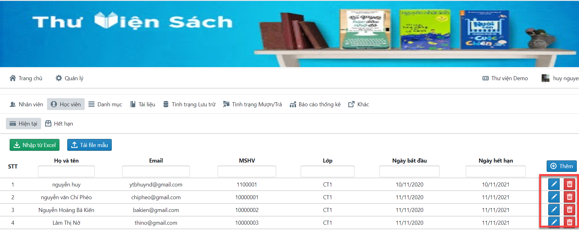 - Để sửa hoặc xóa 1 học viên bấm vào nút sửa, xóa tương ứng của học viên như hình :